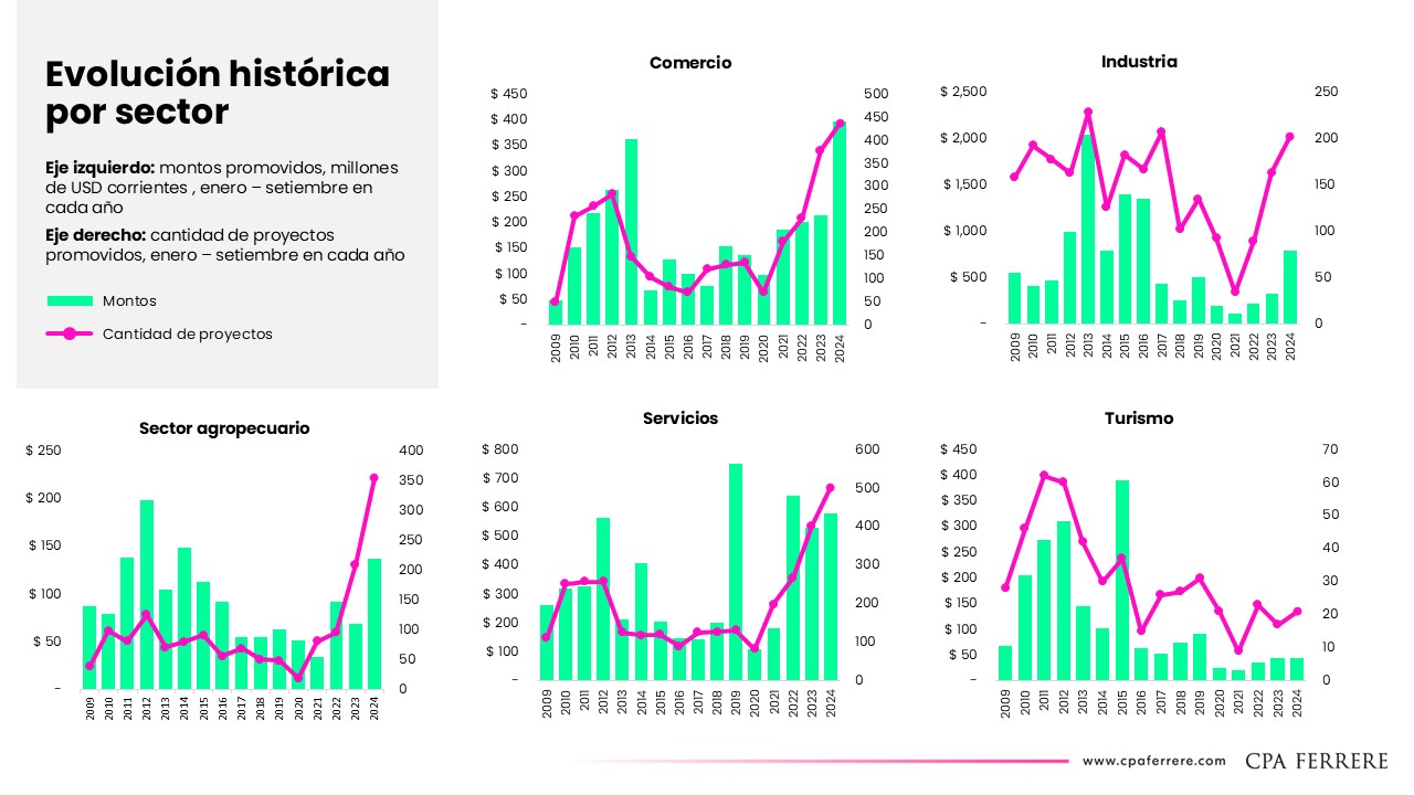 Se observan aumentos en cada uno de los sectores tanto en montos como en proyectos promovidos. Se destaca el crecimiento del sector Comercio, que ha marcado un récord histórico tanto en montos como en cantidad de proyectos promovidos. Los sectores Agro y Servicios, por su parte, rompieron en 2024 su récord histórico en cuanto a cantidad de proyectos promovidos.