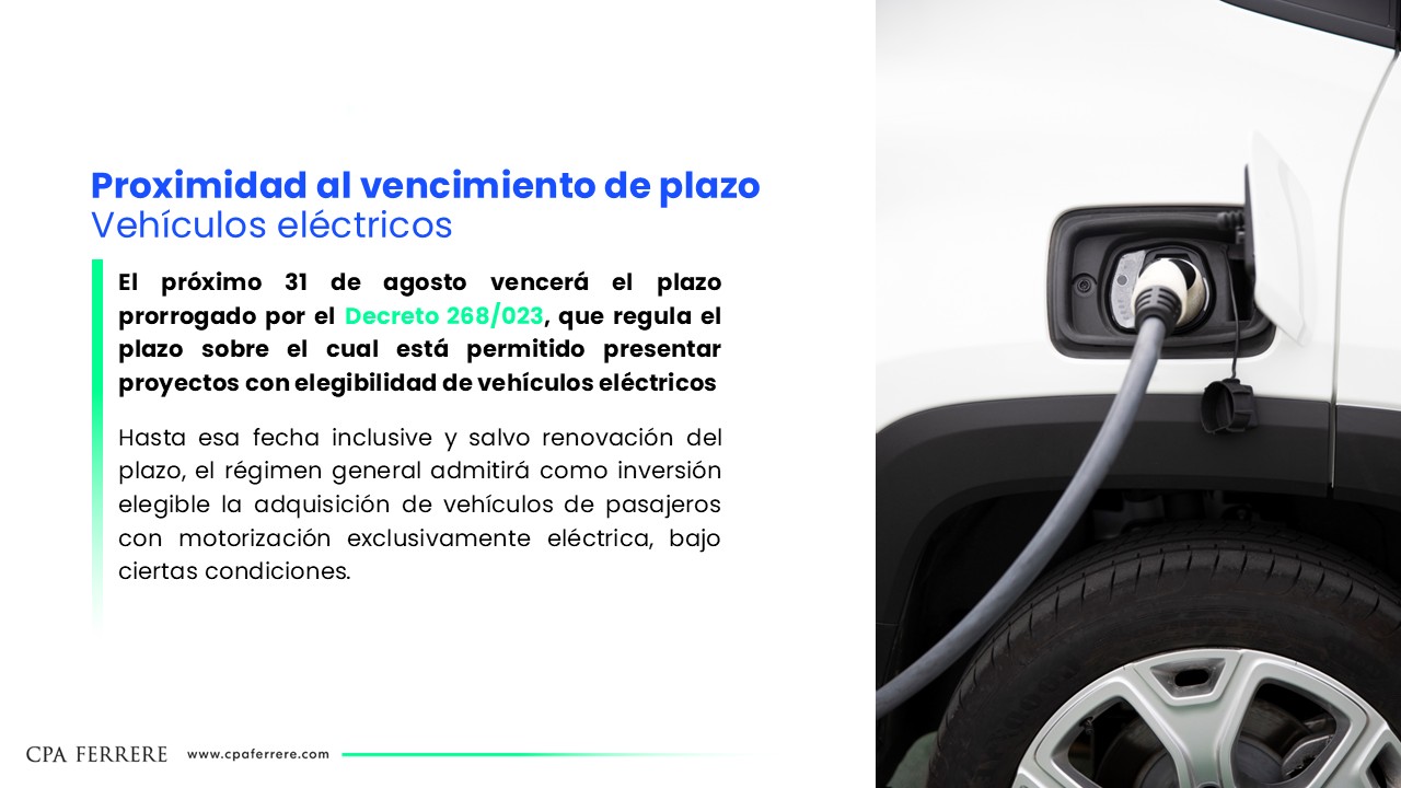 Asimismo, recordamos sobre la proximidad del vencimiento del plazo establecido por el Decreto 268/023, este 31 de agosto, en lo referido a la elegibilidad de las inversiones por el concepto de vehículos eléctricos en el régimen general de promoción de inversiones.